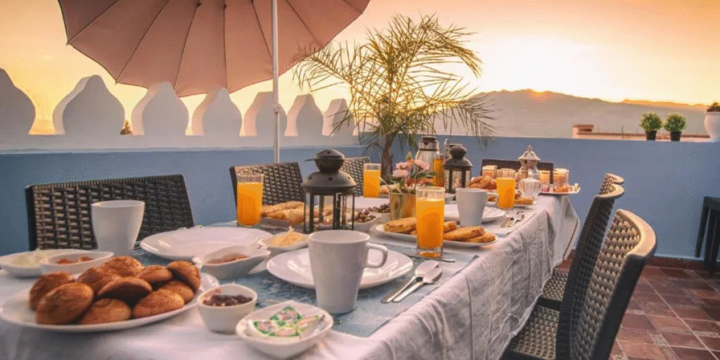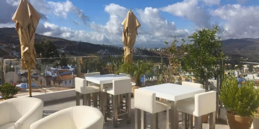 Notre terrasse vous accueille à tout moment de la journée pour une pause détente au grand air. Offrant une vue imprenable sur les toits bleus de la médina, elle est l’endroit idéal pour savourer votre petit-déjeuner, un thé à la menthe, lire un livre, ou simplement profiter du calme et du soleil.